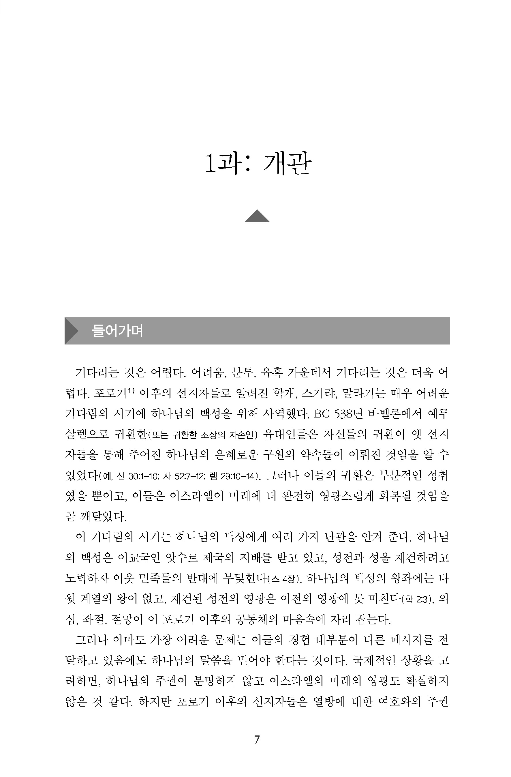 학개ㆍ스가랴ㆍ말라기에는 포로 생활에서 구원받은 후에도 약속의 땅에서 여전히 의심과 낙담과 절망에 시달리는 하나님의 백성에게 보내는 메시지가 담겨 있다. 선지자들은 하나님의 백성에게 장차 있을 더 큰 구원을 기다리면서 믿음을 지킬 것을 촉구한다.