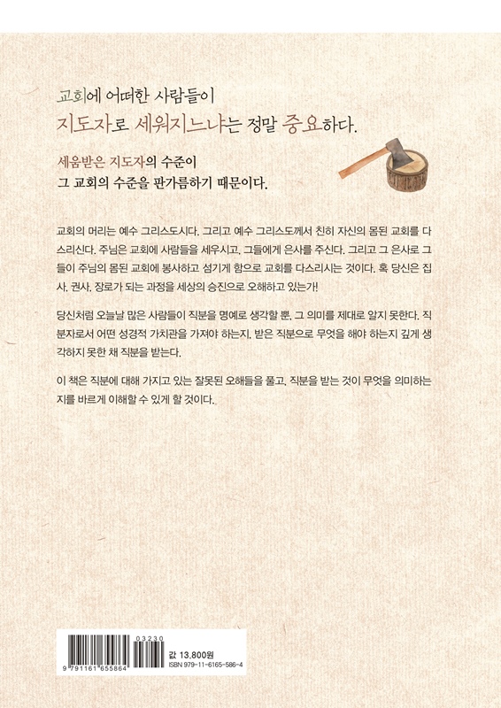 직분자로 쓰임받는다는 것은 정말 영광스럽고 귀한 일입니다. 그러기에 쓸 만한 도끼 한 자루 준비하는 것과 같이 꼼꼼이 정리하며 하나님이 쓰시기에 합당하게 준비되어야 합니다. 도끼머리의 크기가 용도에 맞는 것처럼 직분자로서 하나님 나라와 교회의 본질과 거기에 걸맞는 비전을 붙잡아야 합니다. 도끼의 날이 무뎌지지 않고 날카롭게 유지되도록 직분자에게 필요한 기술과 역량을 강화시키며 극대화해야 합니다. 그래서 최선을 다해 최상의 결과를 하나님께 올려드려야 합니다. 도끼머리의 무게가 스윙하기에 적당하게 무거워야하는 것처럼 예수님을 닮는 인격과 성품으로 무장되어야 합니다. 도끼머리에 제대로 꿰어져 맘껏 휘두를 수 있는 도끼자루처럼 좋은 관계 속에서 이뤄지는 리더십도 갖추어야 합니다. 어느 하나도 소홀히 할 수 없는, 직분자로 세움받을 때 중요한 요소들입니다. …… 그럼에도 불구하고 직분자로서 우리가 잊지 말아야 할 귀한 역석절 진리가 있습니다. 그것은 바울이 말한 것처럼 ‘약한 것이 강함’이라는 것입니다. 사도 바울은 자신에게 자랑할 것이 ‘약한 것’이라고 말합니다. 이런 면에서 직분자로 세움받는 우리 모두가 이 역설적 진리 앞에 겸손히 서야 할 것입니다. …… 우리 모두 언젠가 주님 앞에 서게 될 때 주님으로부터 “잘했다. 착하고 충성된 종아!”라고 칭찬 듣는 직분자들이 되기를 바랍니다. _ 에필로그 중에서