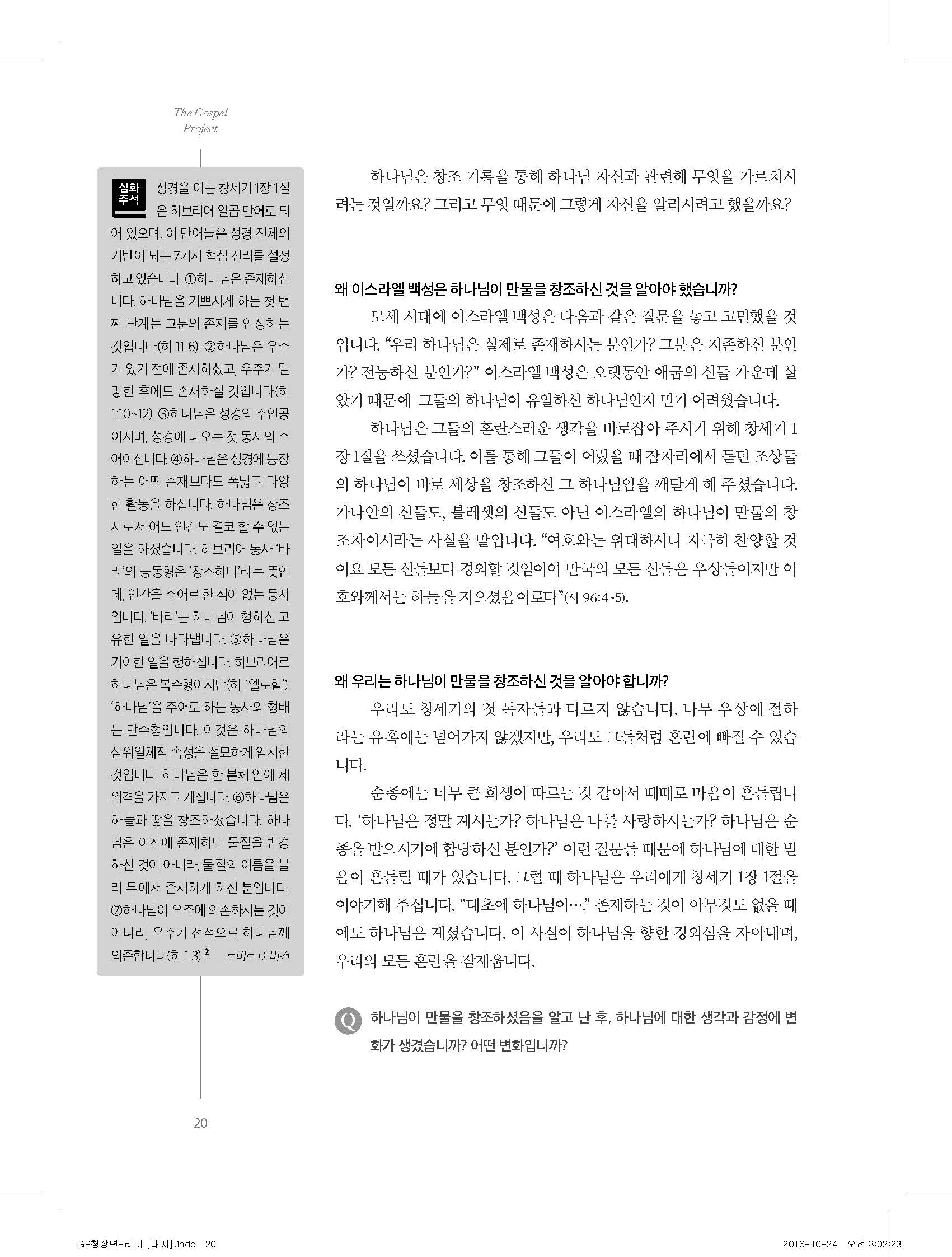 이 책은 《가스펠 프로젝트》 구약 1_위대한 시작의 인도자용 지침서다. 이 책에는 청장년(학습자용)에 들어 있는 모든 내용이 그대로 들어 있으며, 필요한 단락에는 인도자를 위한 추가 설명을 제시했다. 그밖에 인도자가 성경 공부를 인도할 때 참고할 수 있는 심화 주석, 명언, 도입 옵션, 심화 토론과 같은 부가자료들을 다량 제공했다. 본문과 관련하여 교회사적으로 또 주석적으로 중요한 신학자와 목사의 저서에서 발췌한 ‘심화 주석’과 ‘명언’은 평신도뿐 아니라 목회자 인도자도 많은 도움을 받을 수 있다. 또 선택 사항으로 제시한 ‘도입 옵션’과 ‘심화 토론’을 통해 인도자는 학습자의 상황과 수준에 맞게 성경 공부를 인도할 수 있다. 매 세션(과)에 있는 Session Plan에는 세션 포인트와 질문을 한눈에 정리해 놓아 인도자가 흐름을 놓치지 않고 성경 공부를 인도할 수 있게 했다.