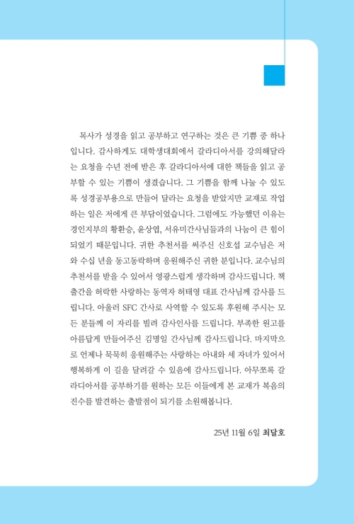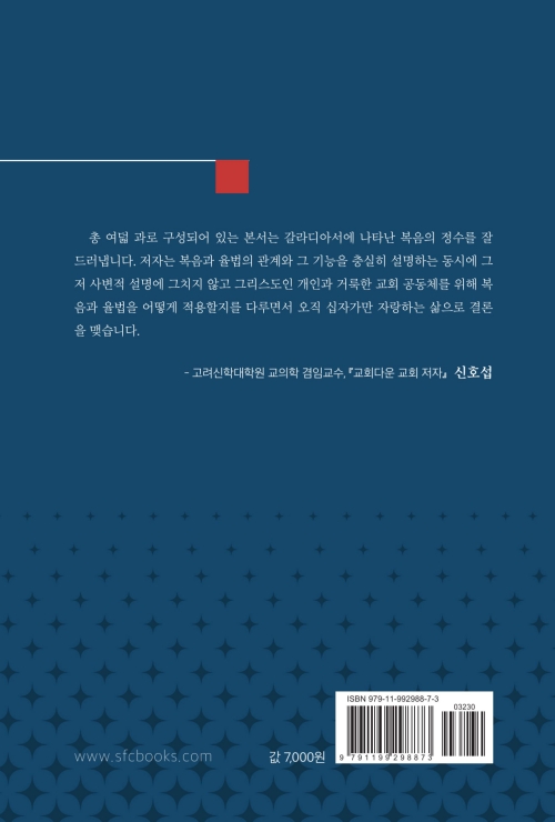 지난 수십 년간 가까이서 함께 교제해 온 최달호 목사님은 거의 평생을 SFC(학생신앙운동)와 함께 했습니다. 그 많은 세월 동안 저는 최 목사님과 함께 중고등부 대학부 동기 하기수련회를 비롯해 전국 SFC 수련회 강사로 협력해 왔습니다. 10여 년 전 섬기던 대학부 학생들과 함께 꾸려진 연합단기선교팀을 이끌고 필리핀 선교여행도 함께 다녀왔습니다. 최달호 목사님은 실로 학생신앙운동의 대부라 할 만합니다. 그런 최달호 목사님이 금번에 전국 대학생대회에서 강의했던 갈라디아서 연구를 더욱 다듬어 매우 유익한 성경공부교재로 저술한 일을 크게 축하합니다. 총 여덟 과로 구성되어 있는 본서는 갈라디아서에 나타난 복음의 정수를 잘 드러냅니다. 최달호 목사님은 복음과 율법의 관계와 그 기능을 충실히 설명하는 동시에 그저 사변적 설명에 그치지 않고 그리스도인 개인과 거룩한 교회 공동체를 위해 복음과 율법을 어떻게 적용할지를 다루면서 오직 십자가만 자랑하는 삶으로 결론을 맺습니다.