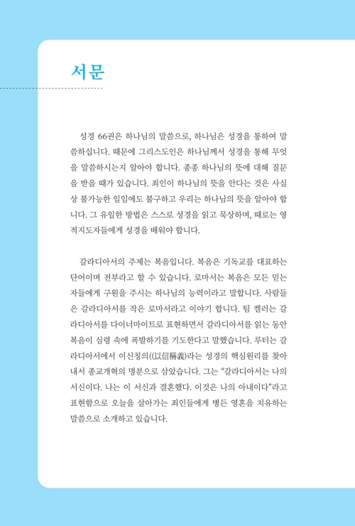 에도 여전히 기복주의와 번영주의와 같은 예수 그리스도의 십자가 외에 다른 복음이 성행하고 있기 때문입니다. 그러나 우리는 사도들이 전해준 예수 그리스도의 십자가 복음 이외에 다른 복음을 따르거나 전해서는 안 됩니다. 선지자 아모스는 사람들이 양식이 없어 주림이 아니며 물이 없어 갈함이 아닌 여호와의 말씀을 듣지 못한 기갈의 시대를 예언합니다(암 8:11). 실로 오늘날이 그러합니다. 너무나 쉽게 이런 저런 말씀을 보고 들을 수 있는 시대이나 영혼을 변화시키는 참된 복음의 말씀이 희귀한 시대입니다. 이런 때에 하나님께서 이 책을 통해 죄인이 오직 믿음으로 말미암아 의롭게 되는 복음을 드러내시어 영혼의 참된 부흥이 일어나는 일에 귀하게 사