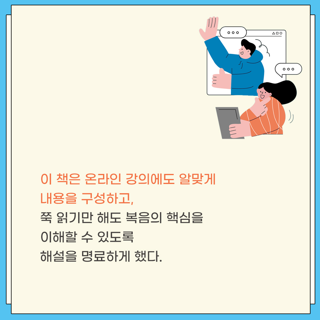 만화와 삽화를 통해 배울 내용에 쉽게 다가가고, 관련된 성경 말씀과 질문을 접하면서 묵상하고 스스로 생각해보며, 이어지는 명료한 설명을 읽고 복음이 말하는 바를 자연스럽게 익힐 수 있다. 책을 쭉 읽으면서 말씀 앞에서 나를 되돌아보고 질문을 통해 자신의 상태와 상황을 점검해볼 수 있다.