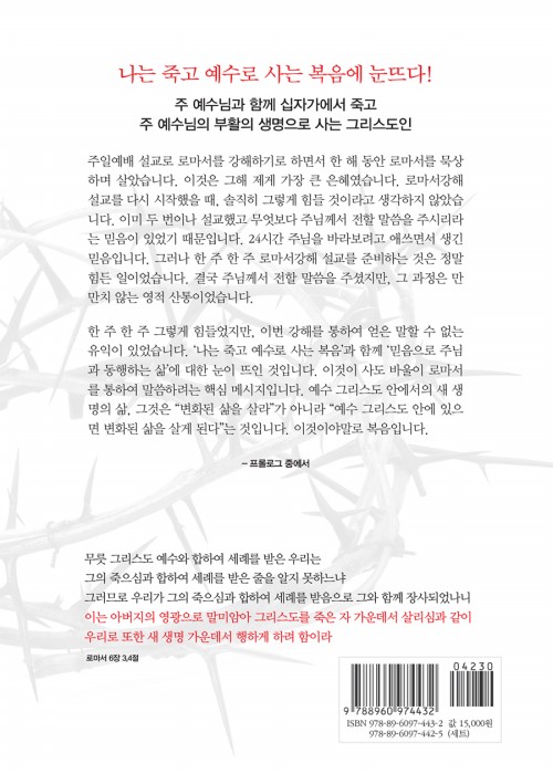한 주 한 주 그렇게 힘들었지만, 이번 강해를 통하여 얻은 말할 수 없는 유익이 있었습니다. ‘나는 죽고 예수로 사는 복음’과 함께 ‘믿음으로 주님과 동행하는 삶’에 대한 눈이 뜨인 것입니다. 이것이 사도 바울이 로마서를 통하여 말씀하려는 핵심 메시지입니다. 예수 그리스도 안에서의 새 생명의 삶, 그것은 “변화된 삶을 살라”가 아니라 “예수 그리스도 안에 있으면 변화된 삶을 살게 된다”는 것입니다. 이것이야말로 복음입니다.