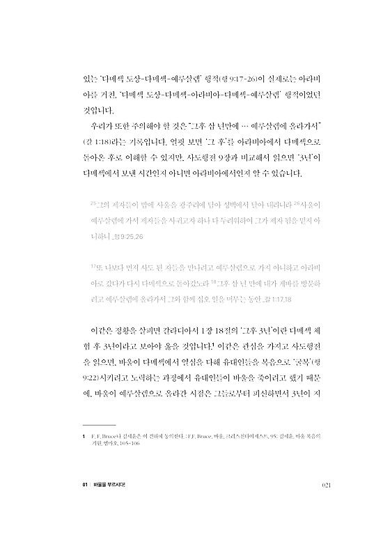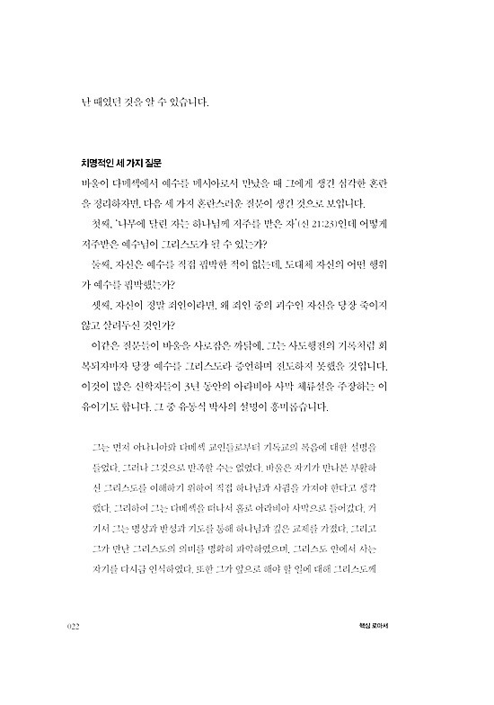 예수님과 한 몸이 된 사람들이 기독교인이기에, 기독교인을 핍박하는 것은 예수님을 핍박하는 것과 같다는 인식에 이른 것입니다. 이 사실은 그에게 엄청난 충격이 되었습니다. 하나님이신 그리스도가 피조물인 인간들과 자신을 동일시한다는 사실은 감당할 수 없는 감격이고 흥분되는 사건입니다. 이 사실을 깨달은 순간, 바울은 더 이상 자신을 위해 사는 것에 의미가 없어졌습니다. p 22