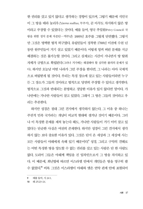 야웨가 이스라엘에게 땅을 주신 것은 의에 대한 보상이라기보다는 죄에 대한 야웨의 전쟁 때문이었다는 것이 분명해진다. 언약 바깥으로 발을 내디딘 이스라엘 사람은 가나안 사람과 다를 바 없고, 언약을 받아들인 가나안 사람은 축복을 누린다. 가나안에서 일어난 사건들이 종족 근절이라는 상투적인 비난을 받지만, 그 사건들을 종족 근절과 구분해 주는 것은 바로 이 근본적인 점이다. 야웨는 ‘다른 민족’을 마귀처럼 여기는 어떤 쩨쩨한 민족 신이 아니다. 야웨는 온 땅의 하나님으로, 그분의 목적은 모든 사람을 그분과 관계 맺도록 회복시키는 것이다. _6장 죄와 전쟁하신 야웨