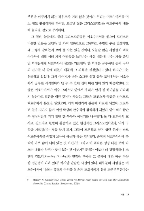 하나님의 목적에는 언제나 어느 정도 신비한 면이 있다. 하지만 여호수아서는 주의 깊게 하나의 유형을 제시하는 게 분명해 보인다. 그 유형에서 사람들은 언제라도 하나님의 심판을 받는 위치였다가 그분 백성의 일부가 되고, 그럼으로써 하나님의 약속들 안에서 살도록 옮겨갈 가능성이 있었다. 어떤 의미에서 여호수아서에서 나타난 심판은 최후 심판의 맛보기라고 이해해야 할 것이다. _서론