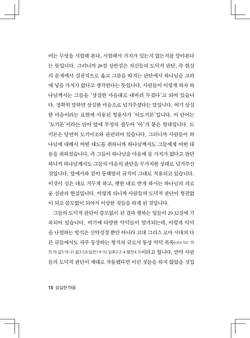 그래서 더욱 죄에 대한 상세한 설명이 필요하지 않을까 생각합니다. 사실 이 주제를 별도로 다룰 의도는 없었는데, 로마서 전체를 강해 설교로 하다가 보니 이 부분을 다루지 않을 수 없었습니다. 사도 바울은 로마서 1:28-32에서 긴 악덕의 목록을 나열하고 있습니다. 이전에 이 단락을 다룰 때에는 좀 뻔한 이야기 같아서 상세히 다루지 않았는데, 이번에는 아마 마지막 로마서 강설이 될 것이라는 생각에 자세히 다루어 보았습니다.
