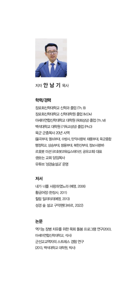안남기 목사는 기독교 상담을 전공한 목회자입니다. 최근 치유목회 연구원에서 개최한 설교와 치유 목회자 포럼에서 ‘상담의 흐름이 있는 치유적 설교’ 제하의 글을 발표하였을 때 “교회는 마치 어머니의 품처럼 안전하고 따듯한 영적 심리적 안정된 공간으로 경험되어질 때 건강한 그리스도인으로서 살아가게 될 것이다”라고 말한 그의 결론을 지금까지 기억하고 있습니다. 성경 숲 설교에서 말씀하시고 또 말씀하셔서 구원에 이르게 하시는 하나님 아버지의 마음을 끈질기고 고집스럽게 증언하며 공감적으로 전해 주고 있어 장시간 좋은 상담자와 상담을 한 것 같은 시원함과 따듯함이 느껴지기도 하였습니다.