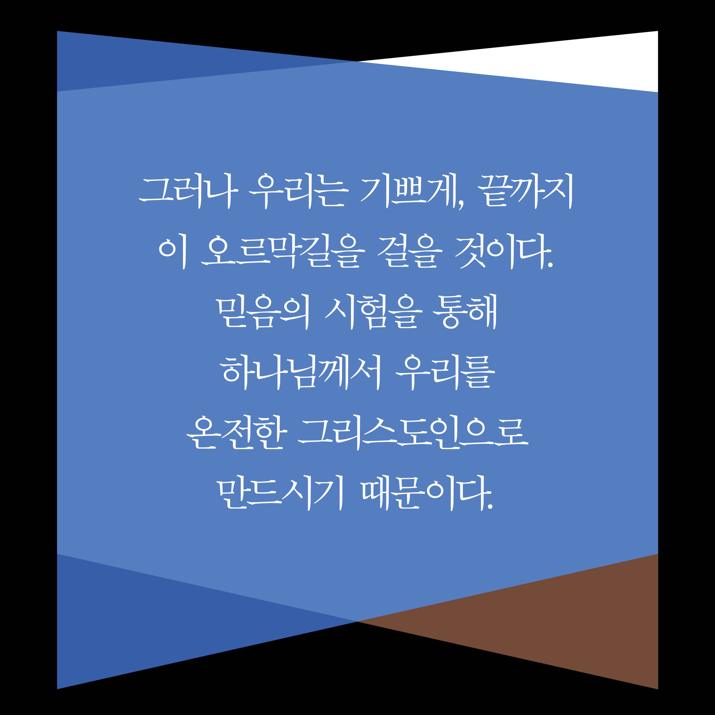 그 길은 힘들고 길다. 그리고 그 과업은 끝나지 않는다. 놀랍고 예기치 않은 첫 번째 시련을 견디고, 시련이 지속되는 동안 그것을 다시 견디고, 그다음에도 계속해서 참고 견디는 것이다. 이는 구원의 전체 사역이 완수되는 시점까지 “십자가를 참으[신]”(히 12:2) 주 예수님과도 같다. 그리고 그분 자신은 하나님 아버지 우편에서 영원한 영광을 중단 없이 소유하시게 되었다. 우리는 이렇게 끈질긴 인내를 갖도록 부르심 받는다. 하지만 이 힘든 길을 따라가다 보면 우리도 영광스러운 목적지에 다다르게 된다.