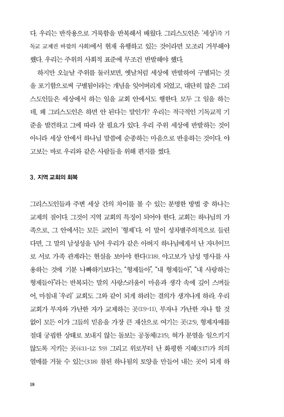 야고보서는 우리가 아무 노력 없이 거룩하게 될 수 없으며, 은혜는 순종을 통해 우리 것이 된다고 말한다. 그리스도인의 거룩함은 혀를 제어하고, 고아와 과부를 돌보며, 자기를 지켜 세속에 물들지 않는 삶으로 증명된다. 삶으로 증명되지 않는 믿음으로는 하나님을 기쁘시게 할 수 없다. 이 책은 지금 우리가 처한 현실과 우리의 행실을 성찰하게 한다. 그리고 질병이나 경제적 어려움 같은 현실적인 고난을 통해 하나님이 우리를 어떻게 새롭게 하시는지 알려 준다.
