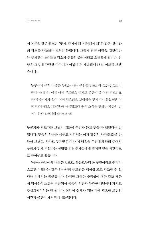 이처럼 저는 전통적 기독교 유산의 후예라고 할 수 있습니다. 어릴 때부터 배워 온 신앙은 제 존재와 정체를 형성했다고 해도 과언이 아닙니다. 그런데 신앙생활을 하는 가운데 어떤 문제에 부딪히게 되었습니다. 물려받은 신앙의 유산에 대해 현실적으로 납득하기 어려운 점들이 보이기 시작했던 것입니다. 제 고민은 신앙의 유산들에 동의할 수 없어서가 아니었습니다. 잘 배워 마음에 담았으나, 배운 신앙을 실제로 실천할 수 없었던 것입니다. 이를테면, 옳은 것을 아는 것과 옳게 사는 것은 다른 문제였습니다. 로마서를 읽을 때도, 복음을 이해는 하지만 복음이 현실과 어떻게 연결되는가가 언제나 문제였습니다. 이제 돌아보면, 그 고민은 신앙 여정에서 시간이 어떤 역할을 하는지에 대해 아직 분명히 이해하지 못했기 때문에 생겨난 것이었습니다.