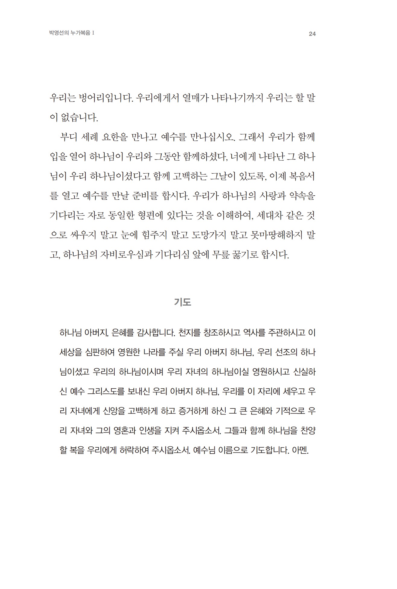 박영선 목사가 2010년 2012년까지 한 누가복음 설교를 글로 펴낸 도서로, 2013년에 출간된 <섬김으로 세우는 나라>의 개정판이다. 씨 뿌리는 비유, 오병이어 기적, 선한 사마리아인의 비유 등을 주제로 한 말씀들이 담겨 있다. 힘이나 권력이 아닌 섬김과 사랑으로 드러나는 예수의 가르침을 배우고 예수를 소유한 자의 넉넉함이란 무엇인지 누가복음에서 확인해 보자.