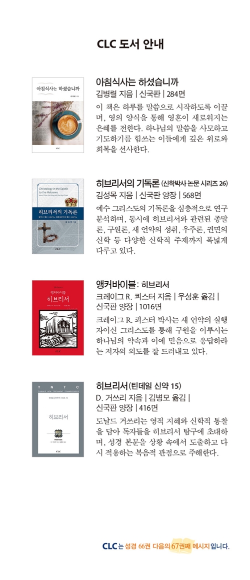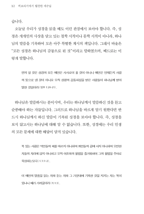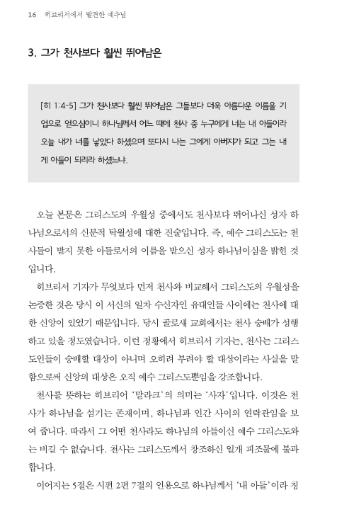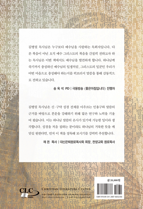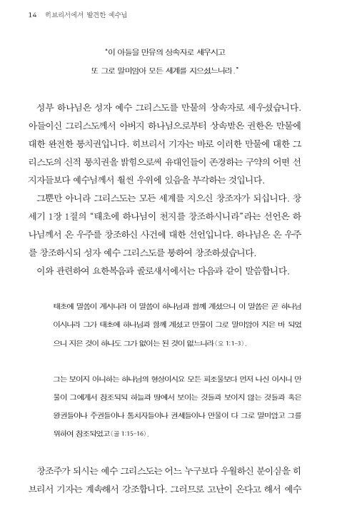 히브리서는 기독교로 개종하였으나 다시 유대교로 돌아가려는 유혹에 직면한 유대인 성도들을 대상으로 한 서신이며, 그들로 하여금 핍박과 유혹에도 그리스도께 대한 신앙을 굳게 지키도록 권면하기 위한 목적으로 기록된 서신입니다. 이 책은 이러한 히브리서를 통해 예수님을 발견하는데 초점을 두었으며 주님께 받은 은혜에 대한 우리의 반응이 어떠해야 하는지를 적용하고 있습니다.