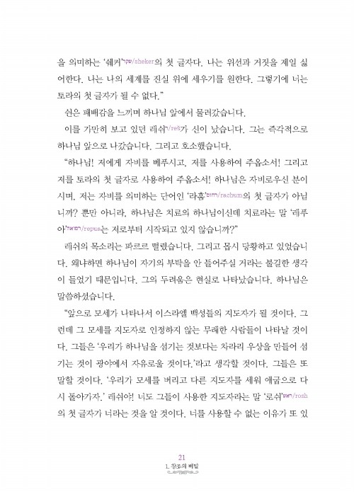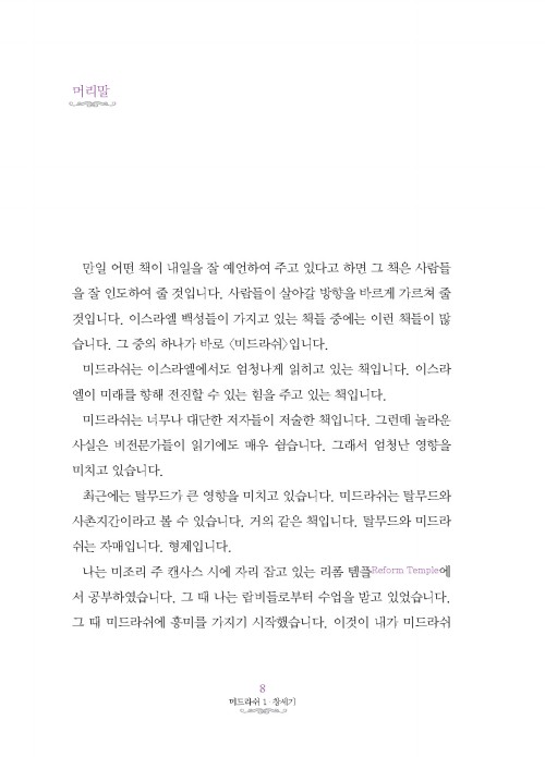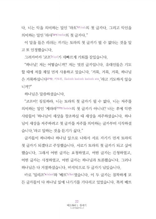 미드라쉬는 성경이 아니다. 전설은 아니되 성경 뒤에 숨어 있는 이야기이다. 절대로 성경과 동격으로 놓으면 안 된다. 유대인들은 그렇게 하나, 우리는 그렇게 하면 안 된다. 참고만 하되, 아주 믿지는 말라고 저자는 권한다. 성경만이 참 진리이기 때문이다.