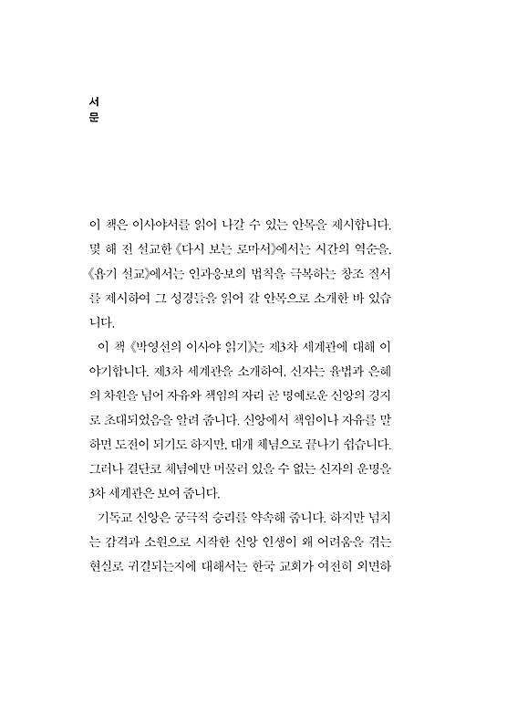 이 책은 이사야서를 읽어 나갈 수 있는 안목을 제시합니다. 몇 해 전 설교한 《다시 보는 로마서》에서는 시간의 역순을 설명했고, 《욥기 설교》에서는 인과응보의 법칙을 극복하는 창조 질서를 제시하여 그 성경들을 읽어 갈 안목으로 소개한 바 있습니다.