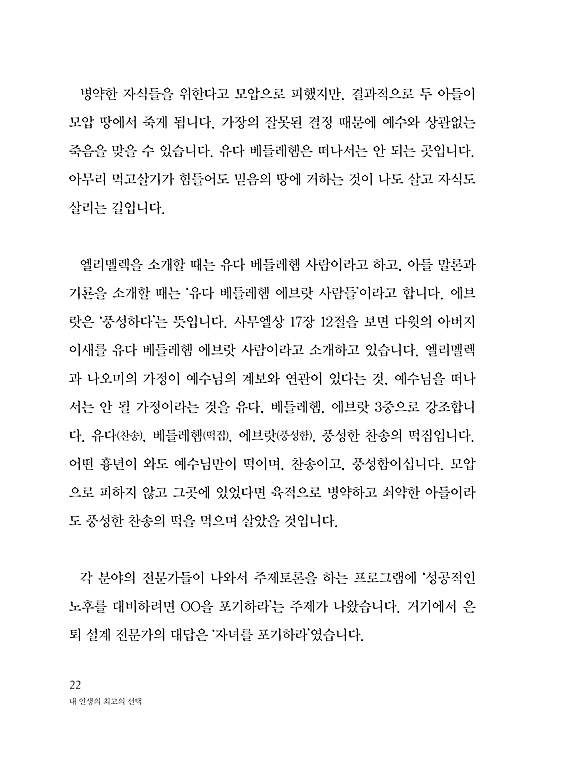 이 책을 읽다 보면 룻기 인물들이 처한 상황이 우리가 살면서 겪는 실제적인 문제들과 밀접한 연관이 있음을 느끼게 됩니다. 그래서 나오미와 룻, 보아스의 삶에 대한 고뇌와 선택들이 우리의 삶으로 깊게 파고들어옴을 경험할 수 있습니다. 저자인 김양재 목사는 “나오미와 룻과 같이 환난당하고, 빚지고, 원통한 자들이 함께하는 교회를 이루는 것은 변함없는 저의 바람”이라고 말합니다. 그러면서 이 책을 통해 힘든 환경에 있다 하더라도 말씀의 인도함을 받기로 결단하고, 내 생각이 아닌 하나님의 뜻을 따르는 ’인생 최고의 선택‘을 하길 축복한다고 전합니다.