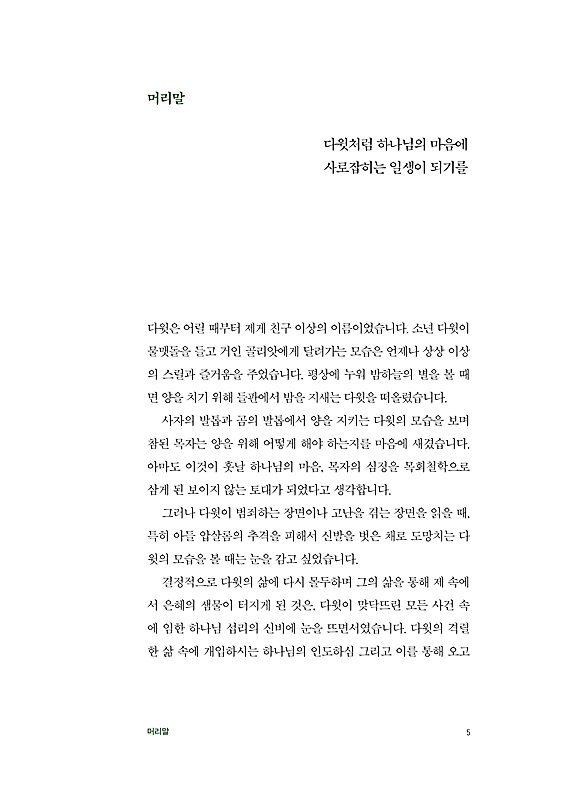 결정적으로 다윗의 삶에 다시 몰두하며 그의 삶을 통해 제 속에서 은혜의 샘물이 터지게 된 것은, 다윗이 맞닥뜨린 모든 사건 속에 임한 하나님 섭리의 신비에 눈을 뜨면서였습니다. 다윗의 격렬한 삶 속에 개입하시는 하나님의 인도하심 그리고 이를 통해 오고 오는 세대에게 주시는 하나님의 마음, 목자의 심정을 깨닫게 되면서 저의 목회 사역은 새로운 차원으로 올려졌습니다. 언제부터인가 제가 경험하고 누렸던 다윗의 영감 어린 일생을 사랑하는 성도들과 함께하고 싶은 간절함은 날로 제 마음을 사로잡았습니다.