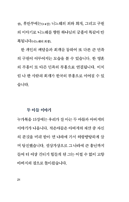 니느웨 사람들의 전적인 돌이킴은 선지자 요나의 노력의 결과도, 니느웨 사람들의 윤리적 결단 때문도 아니었습니다. 오직 하나님의 역사였습니다. 하나님의 은혜로 회개의 역사가 일어난 것입니다. 회개는 언제나 하나님의 역사입니다. 우리가 삶에서 경험할 수 있는 가장 큰 성령의 역사도 바로 회개입니다. 회개는 우리를 죄로부터 건져 살리는 능력이자 하나님께 향하도록 하는 힘입니다. _118p