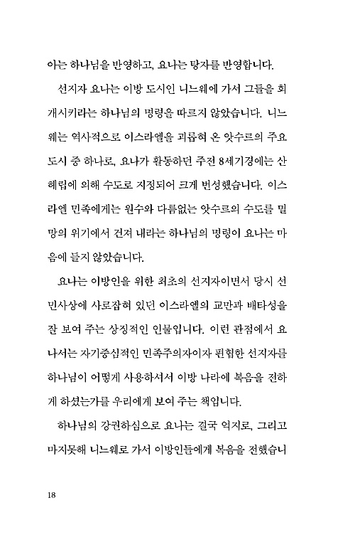 요나서는 기적 같은 이야기입니다. 니느웨의 회개를 죽기보다 싫어했던 전도자 요나의 성의 없는 말 한마디에 온 니느웨가 금식하며 굵은 베옷을 입고 회개하여 구원을 받은 기적 말입니다. 구원은 확실히 하나님께 속한 것입니다. 하나님은 어떠한 경우, 누구를 통해서라도 하나님의 일을 하십니다. _34p