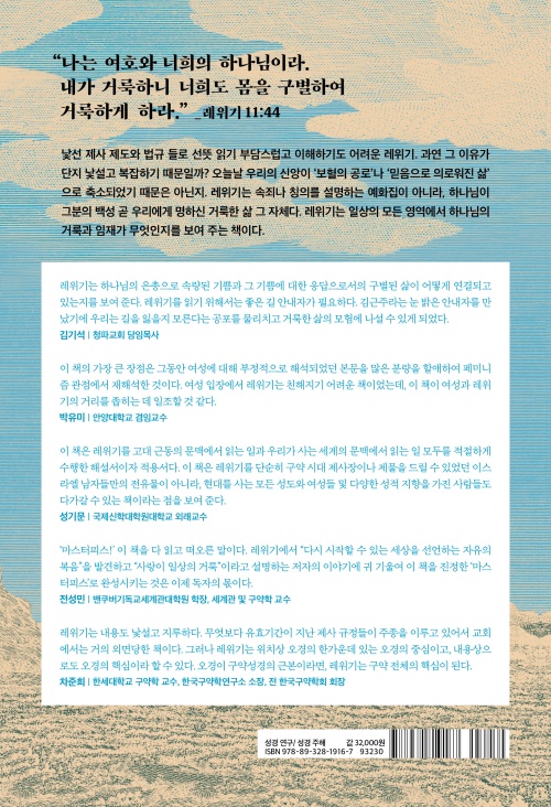 ‘마스터피스!’ 이 책을 다 읽고 떠오른 말이다. 예수 그리스도의 십자가 보혈의 공로만이 우리를 하나님 앞에 서게 한다고 고백하는 구약학자가, 현대의 삶과 관련 없어 보이는 어렵고 복잡한 제사법과 율법으로 가득한 레위기를, 역사적 맥락 속에서 본문의 원래 의미와 의도를 살피는 표준 해석 방법으로, 신약이 완성시킨 성경의 통전성을 추구하며, 21세기 한국 사회가 요청하는 사회적 감수성을 담아낸 이 책은 한국 신학이 얼마나 성숙했는지를 자랑스럽게 보여 준다. 이는 단지 저자 김근주만의 힘이 아니다. 지 이 땅에서 이웃과 더불어 살아가며 치열하게 연구하는 학문 공동체의 존재와, 그런 연구와 삶의 진가를 알아보고 세상에 알리는 출판사의 용기와 역량이 이를 가능하게 했다. 저자의 어떤 해설들은 독자들에게 익숙한 전통과 충돌할지도 모른다. 그런 긴장을 딛고 레위기에서 “다시 시작할 수 있는 세상을 선언하는 자유의 복음”을 발견하고 “사랑이 일상의 거룩”이라고 설명하는 저자의 이야기에 귀 기울여 이 책을 진정한 ‘마스터피스’로 완성시키는 것은 이제 독자의 몫이다.