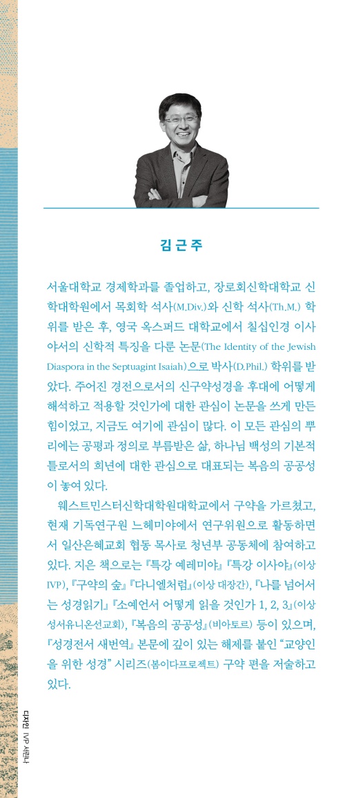 한국 학자가 쓴 레위기에 대한 책이 나오게 되어 매우 기쁘다. 하나님의 이름이 함부로 불리고 교회의 거룩성이 땅에 떨어진 시대에 김근주 교수의 『오늘을 위한 레위기』는 교회의 거룩성을 회복하기 위해 좋은 방향을 제시해 준다. 내 생각에 이 책의 가장 큰 장점은 그동안 여성에 대해 부정적으로 해석되었던 본문을 많은 분량을 할애하여 페미니즘 관점에서 재해석한 것이다. 여성 입장에서 레위기는 친해지기 어려운 성경이었는데, 이 책이 여성과 레위기의 거리를 좁히는 데 일조할 수 있을 것 같아 매우 감사하다.