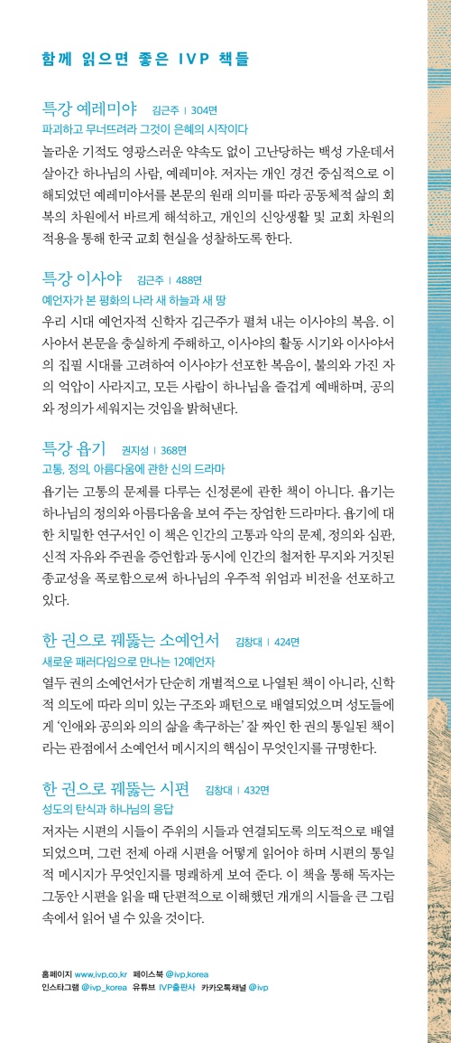 이 책은 잘 읽히지 않는 어제와 잘 읽어야 하는 오늘이 만나 내일을 살게 하는 레위기 주석이다. 낯선 제사 제도와 법규 들로 선뜻 읽기 부담스럽고 이해하기도 어려운 레위기. 과연 그 이유가 단지 낯설고 복잡하기 때문일까? 오늘날 우리의 신앙이 ‘보혈의 공로’나 ‘믿음으로 의로워진 삶’으로 축소되었기 때문은 아닌지. 레위기는 속죄나 칭의를 설명하는 예화집이 아니라, 하나님이 그분의 백성 곧 우리에게 명하신 거룩한 삶 그 자체다. 레위기는 일상의 모든 영역에서 하나님의 거룩과 임재가 무엇인지를 보여 주는 책이다.