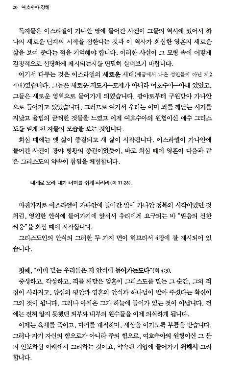 그러나 이스라엘이 가나안에 들어간 일을 여호수아서에 기록되는 모든 사실에 비추어 바라볼 때, 그 이전의 일들을 회심 이전에 영혼이 겪는 경험들로 보고, 또한 가나안에서의 이스라엘의 역사를 그 영혼의 새로운 삶을 묘사하는 것으로 보아야 합니다. -p. 19.