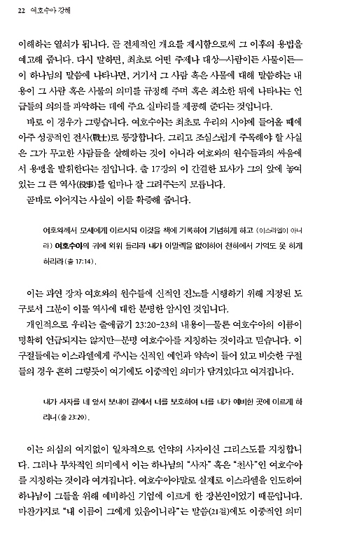 여호수아서는 이스라엘의 역사상 가장 흥미롭고도 중요한 한 부분을 기록하고 있습니다. 이 책은 이스라엘이 하나의 민족으로 확립되는 시기를 다룹니다. … 여호수아서가 없다면 모세오경은 불완전합니다.