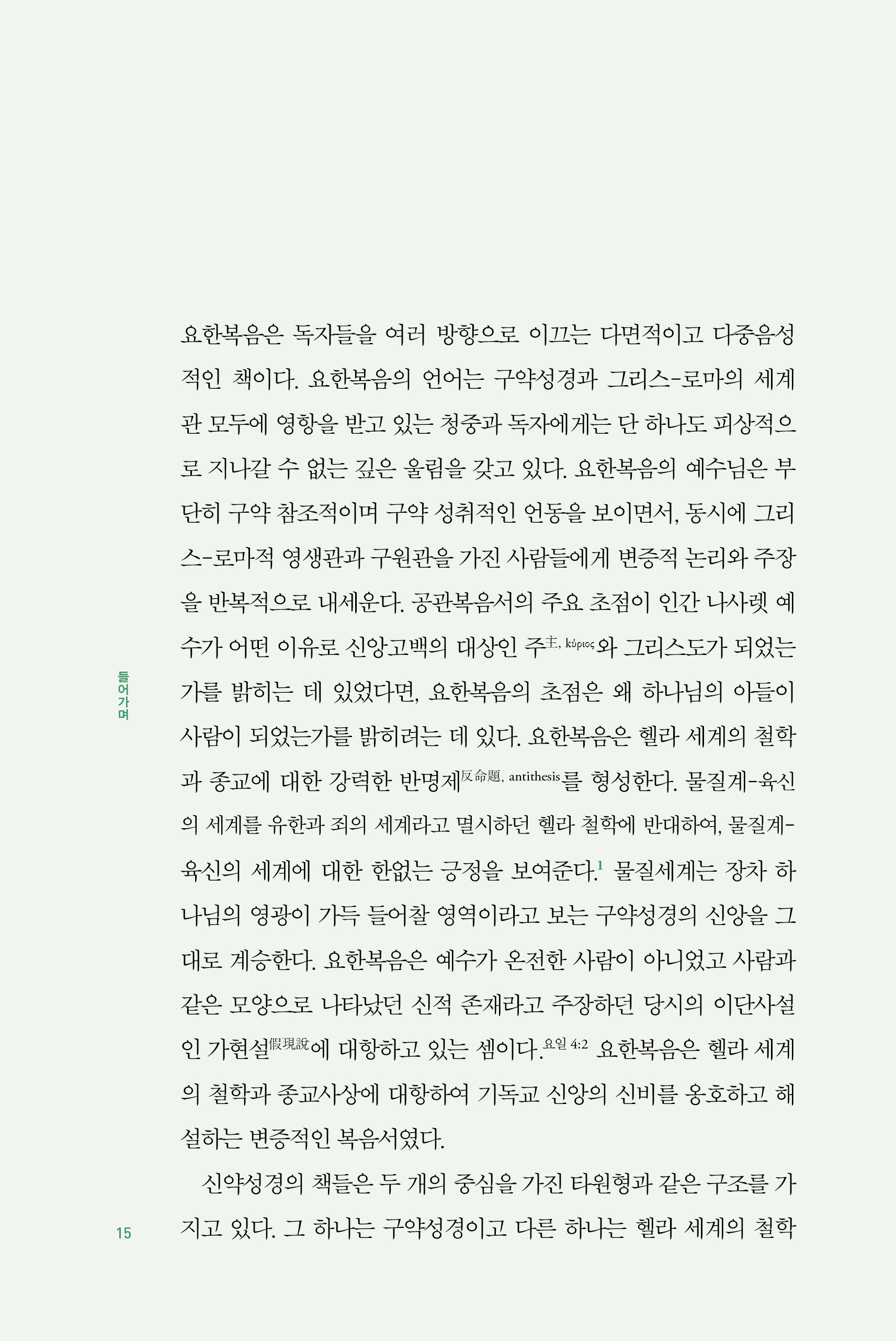 요한복음은 독자에게 놀라움과 당혹감을 동시에 주는 책이다. 처음으로 요한복음을 읽을 때 독자는 그 단순한 진리에 매료된다. 여기에는 하나님이 세상의 창조자이시고, 예수님이 성육신한 구주이며, 예수만이 하나님께 이르는 유일한 길이요, 예수를 믿는 것을 통해서만 생명(영생)을 얻을 수 있다는 진리가 직접적이고 명확하게 표현되어 있다. 그런데 한 글자 한 글자 요한복음을 읽어 나가다 보면, 일상적이지 않은 언어와 보편적이지 않은 논리 전개와 일견 현대인들에게는 지나치게 배타적이라는 느낌의 내용이 많아 당황하게 된다.…이러한 어려움을 인지하고 요한복음을 읽을 때 요한복음의 진수를 새롭게 발견할 수 있다. 요한복음이 이해하기 어려운 이유 중 하나는 구약의 사상과 신학이 요한이라는 한 신학자의 언어 속에 화학적으로 녹아 있기 때문이다. 그는 단순한 언어로 심오한 사상을 표현해낸 사람이다. 또 요한은 이것을 당시 헬라 문화권에 있는 사람들이 이해할 수 있는 언어와 레토릭으로 풀어내기 때문이다.