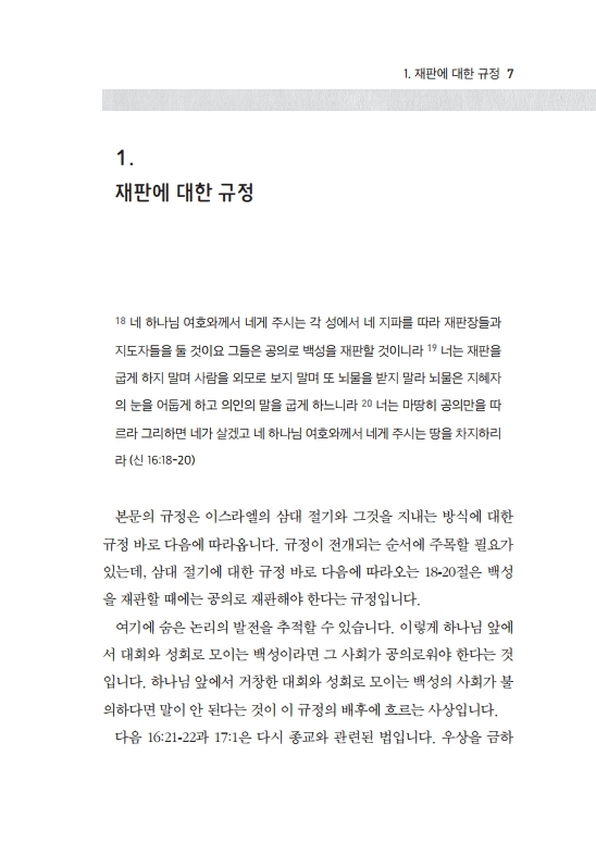 본문의 규정은 이스라엘의 삼대 절기와 그것을 지내는 방식에 대한 규정 바로 다음에 따라옵니다. 규정이 전개되는 순서에 주목할 필요가 있습니다. 삼대 절기에 대한 규정 바로 다음에 따라오는 18-20절은 백성을 재판할 때에는 공의로 재판해야 한다는 규정입니다. 여기에 숨은 논리의 발전을 추적할 수 있습니다. 이렇게 하나님 앞에서 대회와 성회로 모이는 백성이라면 그 사회가 공의로워야 한다는 것입니다. 하나님 앞에서 거창한 대회와 성회로 모이는 백성의 사회가 불의하다면 말이 안 된다는 것이 이 규정의 배후에 흐르는 사상입니다.