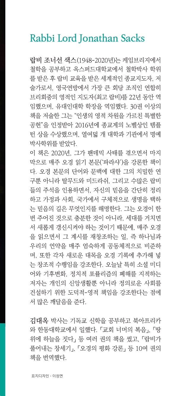이 책은 2020년, 랍비 조너선 색스가 팬데믹 봉쇄사태를 겪으면서 마지막으로 매주 오경 읽기 본문(파라샤)을 해설한 책이다. 오경 본문의 단어와 문맥에 대한 그의 치밀한 연구뿐 아니라 탈무드와 미드라쉬, 그리고 수많은 랍비들의 주석을 인용하면서, 자신의 믿음을 간단히 정리하고 가정과 사회, 정치와 경제생활에서 구체적으로 생명을 택하는 믿음의 길은 무엇인지를 해명한다. 그는 오경이 한 번 주어진 것으로 충분한 것이 아니라, 세대를 거치면서 새롭게 갱신시켜야 하는 것이기 때문에, 매주 오경을 읽으면서 그 계시를 재창조하는 일, 즉 하나님과 우리의 언약을 매주 엄숙하게 공동체적으로 비준하며, 또한 각자 새로운 대목을 오경 기록에 추가해 넣는 창조적 수행임을 강조한다. 오늘날 특히 소셜 미디어와 기후 변화, 정치적 포퓰리즘의 폐해를 지적하는 저자는 개인의 신앙생활뿐 아니라 정의로운 사회를 건설하기 위한 도덕적-영적 책임을 강조한다는 점에서 많은 깨달음을 준다.