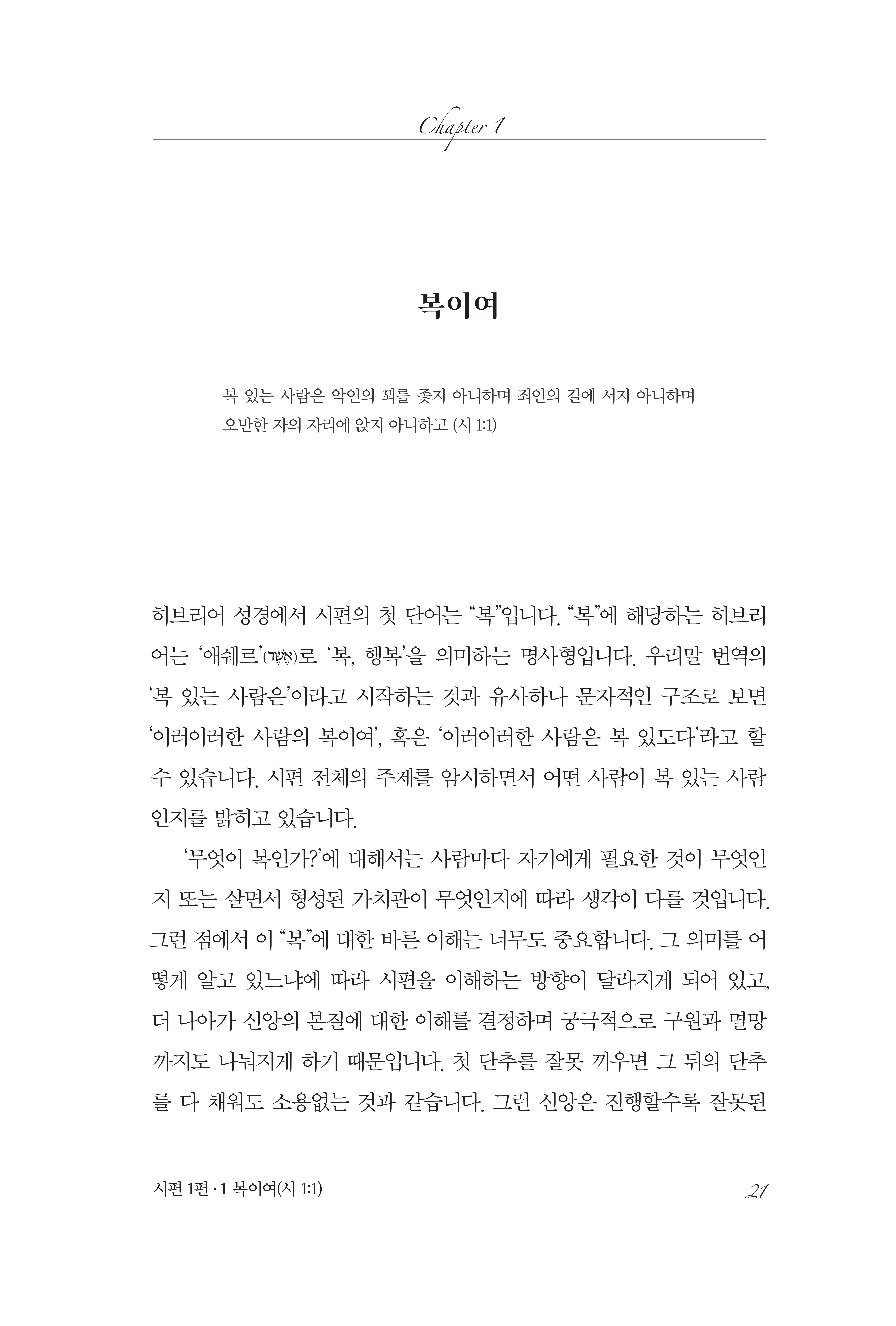 시편은 유독 선호하는 구절 위주로 기억되거나 주제 위주로 한데 묶어서 이해된다. 신혁 목사는 시편에도 문맥이 있고 그 흐름 따라야만 얻을 수 있는 주제와 깨달음이 있다고 한다. 개인적 사변이 아닌 기독교 역사 안에 복된 믿음의 선조들이 한 구절 한구절 묵상하며 남겨 놓은 심오한 깨달음과 은혜를 정리하여 신앙의 형제들과 함께 나누고자 이 책을 만들었다.