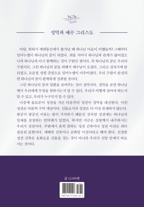 부교역자 시절, 때마다 제 설교 원고를 제본해주셨던 이동성 장로님과 김은실 권사님께 이 지면을 빌려 감사의 뜻을 전합니다. 그 덕에 제가 지금까지 스무 권 넘는 책을 쓰게 되었습니다. 감사 인사가 늦은 점이 송구합니다. 출판을 위해 애쓰신 베드로서원 방주석 장로님과 정진혁 부장님, 그리고 베드로서원 가족들에게도 깊은 감사를 느낍니다. 이 책을 읽는 모든 분들께 성막을 통해서 제가 깨달은 은혜가 그대로 전달되기를 소망하는 마음으로 두 손을 모읍니다.