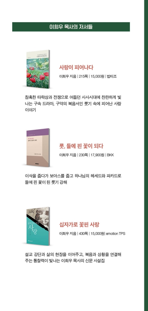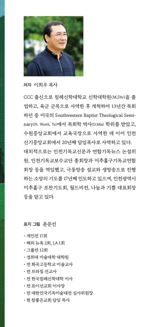 저자께서 설교와 글쓰기에 탁월하다는 것은 이미 잘 알려진 사실입니다. 강단을 통해 전해지는 저자의 설교가 교회와 성도들의 삶을 풍성하게 하고 영적 부흥을 경험하게 합니다. 또한 10년간 쓰신 인천기독교신문 사설 모음집 『십자가로 꽃핀 사랑』을 출간하고, 그리고 인천광역시 중앙도서관의 요청으로 『룻, 들에 핀 꽃이 되다』를 발간하셨고, 두 달 전에는 개정판으로 『사랑이 피어나다』(룻기, 절망 중에 피어난 사랑이야기)를 발간하셨습니다. 그뿐만 아니라, 17년간 극동방송의 “소망의 기도” 코너 진행과 방송 설교를 통해 수많은 청취자에게 큰 위로와 도전을 주셨습니다.