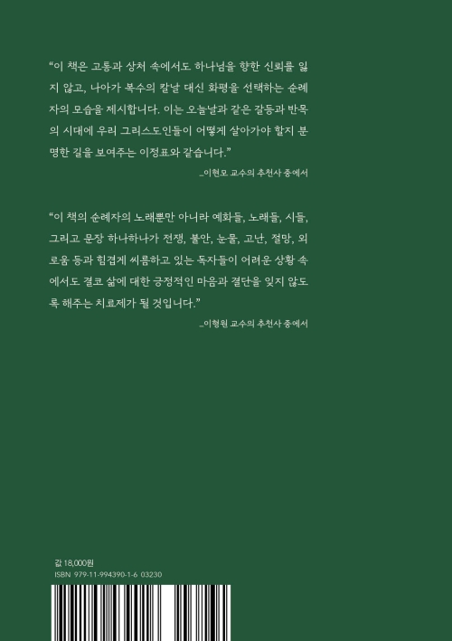 이 책은 고통과 상처 속에서도 하나님을 향한 신뢰를 잃지 않고, 나아가 복수의 칼날 대신 화평을 선택하는 순례자의 모습을 제시합니다. 이는 오늘날과 같은 갈등과 반목의 시대에 우리 그리스도인들이 어떻게 살아가야 할지 분명한 길을 보여주는 이정표와 같습니다. 저자의 탁월한 통찰력과 깊은 영성이 담긴 이 책을 통해, 우리의 삶이 고난 중에도 기뻐하고, 눈물 속에서도 노래하는 진정한 순례자의 여정으로 변화되기를 간절히 소망합니다.