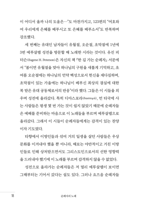 1. 저자는 구약학자들이 시편을 이해하는 데 필수 요소로 간주하는 ‘삶의 자리’(삶의 상황)에 관해 쉽고도 명확하게 풀이해 줍니다. 아울러 현재의 독자들이 씨름하고 있는 삶의 상황들과 연관 짓고 있습니다. 그래서 시편 120편부터 134편에서 소개되는 고대 이스라엘 순례자의 노래가 독자들의 인생 순례 중에도 부를 수 있고, 불러야 하는 노래로 깨닫도록 도와줍니다.