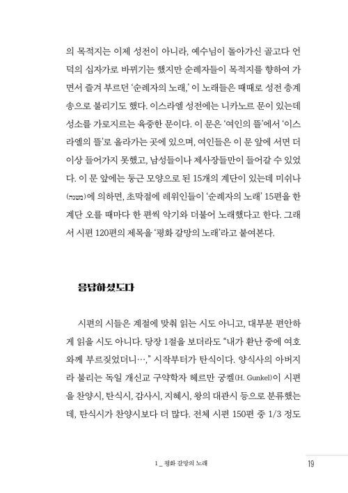3. 이 책은 고대 이스라엘 백성들이 순례길에서 만든 신앙고백과 기도를 통해 삶과 신앙의 교훈을 제시하면서도, 궁극적으로는 본문을 통해 예수 그리스도를 소개합니다. 그리고 그리스도께서 성도들에게 제공하는 삶의 다양한 복들을 다시 기억하도록 돕습니다.