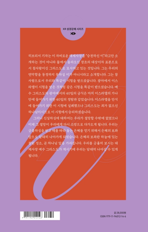 히브리서 기자는 이 자비로운 대제사장을 "승천하신 이"라고만 소개하는 것이 아니라 물에서 올라오신 창조의 대상이자 표본으로서 참사람이신 그리스도로 묘사하고 있는 것입니다. 그는 우리의 연약함을 동정하지 못하실 이가 아니시라고 소개합니다. 그는 참 사람으로서 우리와 똑같이 시험을받으셨습니다. 광야에서 이스라엘이 시험을 받은 것처럼 같은 시험을 똑같이 받으셨습니다. 예수 그리스도의 광야에서의 40일의 금식은 마치 이스라엘의 가나안에 들어가기 위한 40일의 정탐과 같았습니다. 이스라엘을 안식에 들어가기 위한 이 시험에 실패했으나 그리스도는 죄가 없으신하나님이시므로 이 시험에서 승리하셨습니다.