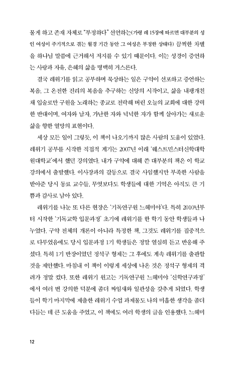 저자는, 레위기를 읽는다는 것은 구약과 신약의 관계를 근본적으로 알기 위한 첫걸음이라고 소개한다.