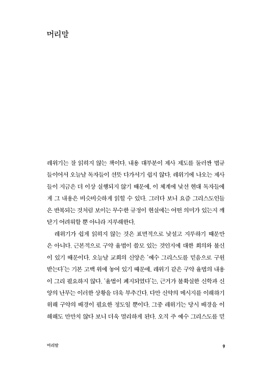 이 책은 잘 읽히지 않는 어제와 잘 읽어야 하는 오늘이 만나 내일을 살게 하는 레위기 주석이다.