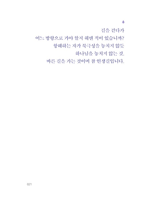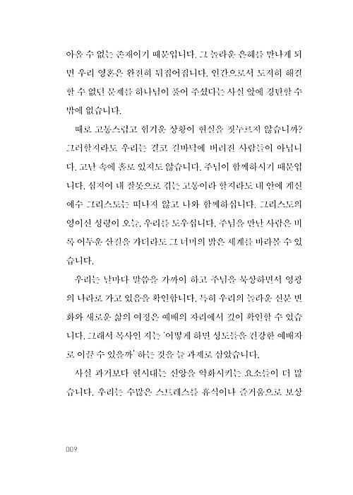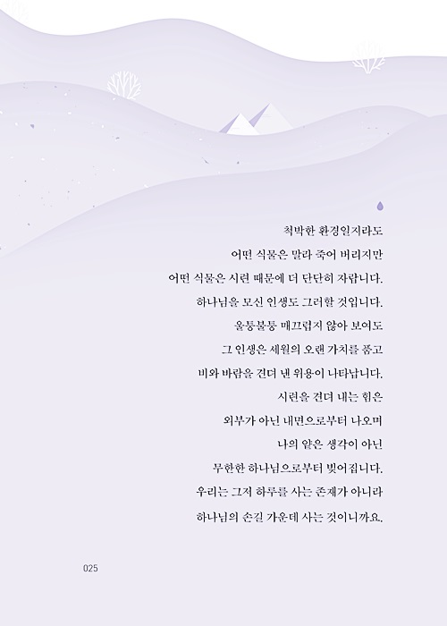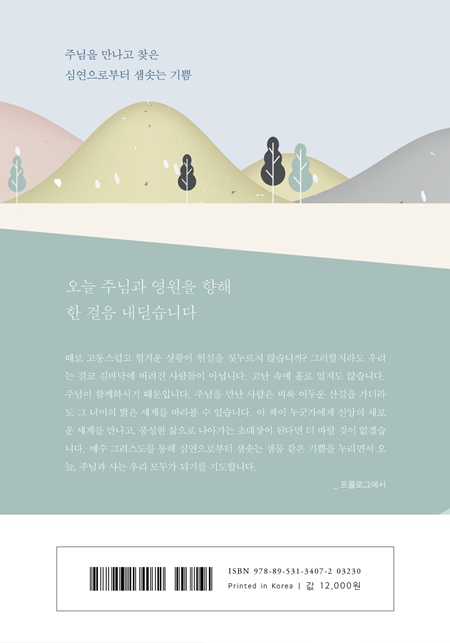 때로 고통스럽고 힘겨운 상황이 현실을 짓누르지 않습니까? 그러할지라도 우리는 결코 길바닥에 버려진 사람들이 아닙니다. 고난 속에 홀로 있지도 않습니다. 주님이 함께하시기 때문입니다. 주님을 만난 사람은 비록 어두운 산길을 가더라도 그 너머의 밝은 세계를 바라볼 수 있습니다. 이 책이 누군가에게 신앙의 새로운 세계를 만나고, 풍성한 삶으로 나아가는 초대장이 된다면 더 바랄 것이 없겠습니다. 예수 그리스도를 통해 심연으로부터 샘솟는 샘물 같은 기쁨을 누리면서 오늘, 주님과 사는 우리 모두가 되기를 기도합니다.