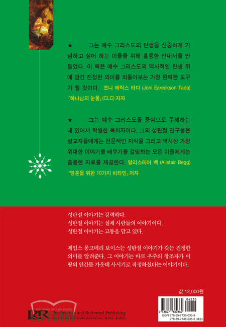 성탄절 이야기는 우리가 아는 것 이상의 의미를 담고 있다. 인류 역사상 가장 특별한 이야기가 바로 성탄절 이야기지만 그것의 진정한 의미를 아는 이들은 많지 않다. 심지어 그리스도인들조차 단순히 아기 예수님이 오신 날 정도로 생각하며 그날을 보낸다. 그러나 왜 하나님이신 예수님이 아기의 모습으로 오셨는지 그 진짜 의미를 깨닫는 다면 성탄절 이야기가 전혀 다르게 다가올 것이다. 저자 제임스 몽고메리 보이스는 전통있는 개혁주의 신학과 목회적인 통찰력을 바탕으로 성탄절 이야기가 갖는 진정한 의미를 보여준다. 이 책을 통하여 풍성하고 은혜로운 성탄절을 보낼 수 있을 것이다.