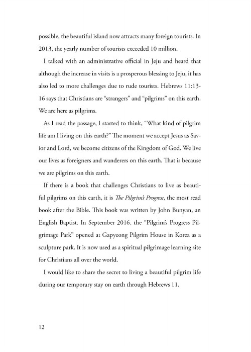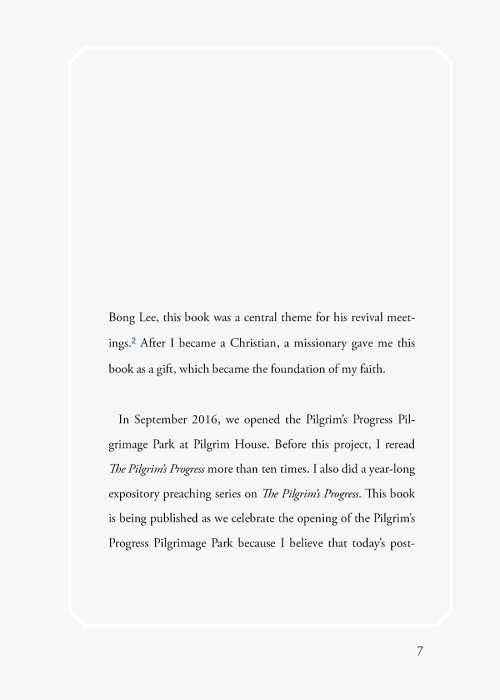 I want to bless the postmodern generation reading this book and pray that you will read the original The Pilgrim’s Progress as well. And please do make a visit to the Pilgrim’s Progress Pilgrimage Park in Gapyeong, Korea. If this book can help solidify the foundation of our faith, that will be pleasing to the Author and Perfecter of our faith. pray that all of us reading this book will finish strong the journey of pilgrimage ahead of us.