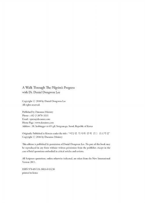 오늘날 대표적인 복음 설교가 이동원 목사의 《이동원 목사와 함께 걷는 천로역정》 영문판이다. 저자가 특별히 천로역정을 주제로 다룬 것은 그것이 개신교 영성을 대표한다고 생각하기 때문이다. 크리스천에게 구원은 영적 여정의 첫걸음이다. 그 뒤에 닥쳐오는 수많은 유혹과 고난, 자신과의 싸움을 이기고 천성을 향해 가는 것이야말로 크리스천의 진정한 영적 여정이라 할 수 있다. 이러한 메시지를 오늘날 한국교회 현실에 맞춰 설교한 이 책은 깊은 영성과 감동적인 메시지를 전달한다.
