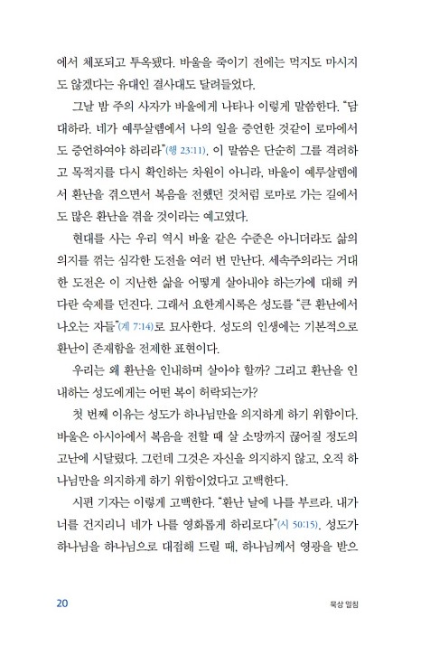 한 개인의 인생에서, 한 나라의 역사에서 아무 문제 없이 편하고 즐겁기만 한 시절은 없었다. 세상에서 내가 가장 힘든 것 같고, 뭐 하나 제대로 풀리는 게 없다고 생각할 때, 한마디로 인생의 바닥이라는 느낌이 들 때도 하나님은 우리에게 여러 차례 기회를 주신다. 묵상을 통해 하나님의 일침을 받은 자는 회복된 영혼에 주시는 하나님의 기회를 찾아내는 ‘탐침’을 얻는다. 흔들리는 마음을 하나님께 고정해, 말씀 안에서 참 평강을 누리는 묵상의 길이 여기에 있다.
