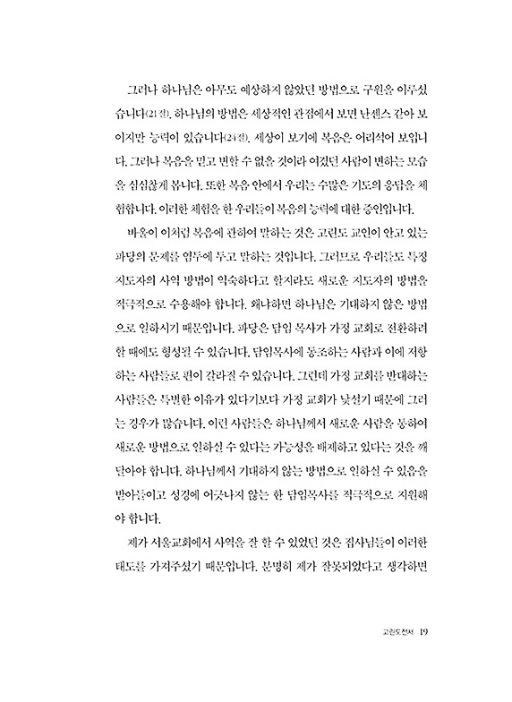 이 집사님은 이렇게 말하며 설교를 마쳤습니다. “하나님이 사업을 망하지 않게 해주실 것입니다. 그러나 망하더라도 하나님을 원망하지 않을 것입니다. 주님도 더 잘 섬길 수 있고 저에게 더 잘 맞는 생업을 주실 것이라고 믿기 때문입니다.” (51p)