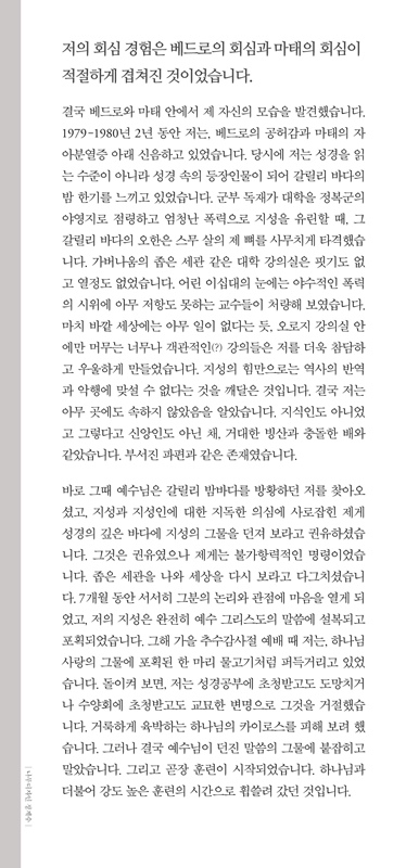 저의 회심 경험은 베드로의 회심과 마태의 회심이 적절하게 겹쳐진 것이었습니다. 결국 베드로와 마태 안에서 제 자신의 모습을 발견했습니다. 1979-1980년 2년 동안 저는, 베드로의 공허감과 마태의 자아분열증 아래 신음하고 있었습니다. 당시에 저는 성경을 읽는 수준이 아니라 성경 속의 등장인물이 되어 갈릴리 바다의 밤 한기를 느끼고 있었습니다. 군부 독재가 대학을 정복군의 야영지로 점령하고 엄청난 폭력으로 지성을 유린할 때, 그 갈릴리 바다의 오한은 스무 살의 제 뼈를 사무치게 타격했습니다. 가버나움의 좁은 세관 같은 대학 강의실은 핏기도 없고 열정도 없었습니다. 어린 이십대의 눈에는 야수적인 폭력의 시위에 아무 저항도 못하는 교수들이 처량해 보였습니다. 마치 바깥 세상에는 아무 일이 없다는 듯, 오로지 강의실 안에만 머무는 너무나 객관적인(?) 강의들은 저를 더욱 참담하고 우울하게 만들었습니다. 지성의 힘만으로는 역사의 반역과 악행에 맞설 수 없다는 것을 깨달은 것입니다. 결국 저는 아무 곳에도 속하지 않았음을 알았습니다. 지식인도 아니었고 그렇다고 신앙인도 아닌 채, 거대한 빙산과 충돌한 배와 같았습니다. 부서진 파편과 같은 존재였습니다.