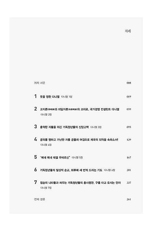 다니엘서는 이런 상황에 직면한 기독청년을 강력하게 도전하고 장엄하게 격려합니다. 다니엘서는 기독청년들을 왜소하게 만들고 그들의 참신한 기백과 상상력을 앗아 가는 거대한 세계정신이라는 우상에 무릎 꿇지 않고 살아가는 길을 제시합니다. 다니엘서의 하나님 나라는 현실도피적이고 내세적인 영역이 아니라, 청년들에게 굴종을 강요하면서 들어오라고 윽박지르는 현실체제를 대체할 대안적 세계질서로 나타납니다. 그것은 하나님과의 내밀한 영적 소통과 형제자매들과의 신령한 교제로, 두렵고 매혹적인 우상들을 혁파해 가는 성령충만한 공동체입니다. 또한 그것은 짐승의 나라들에서 살아갈 수밖에 없는 성도들을 구출하려고 오는 천상적 인자(人子)의 영도력으로 결속된 공동체입니다.