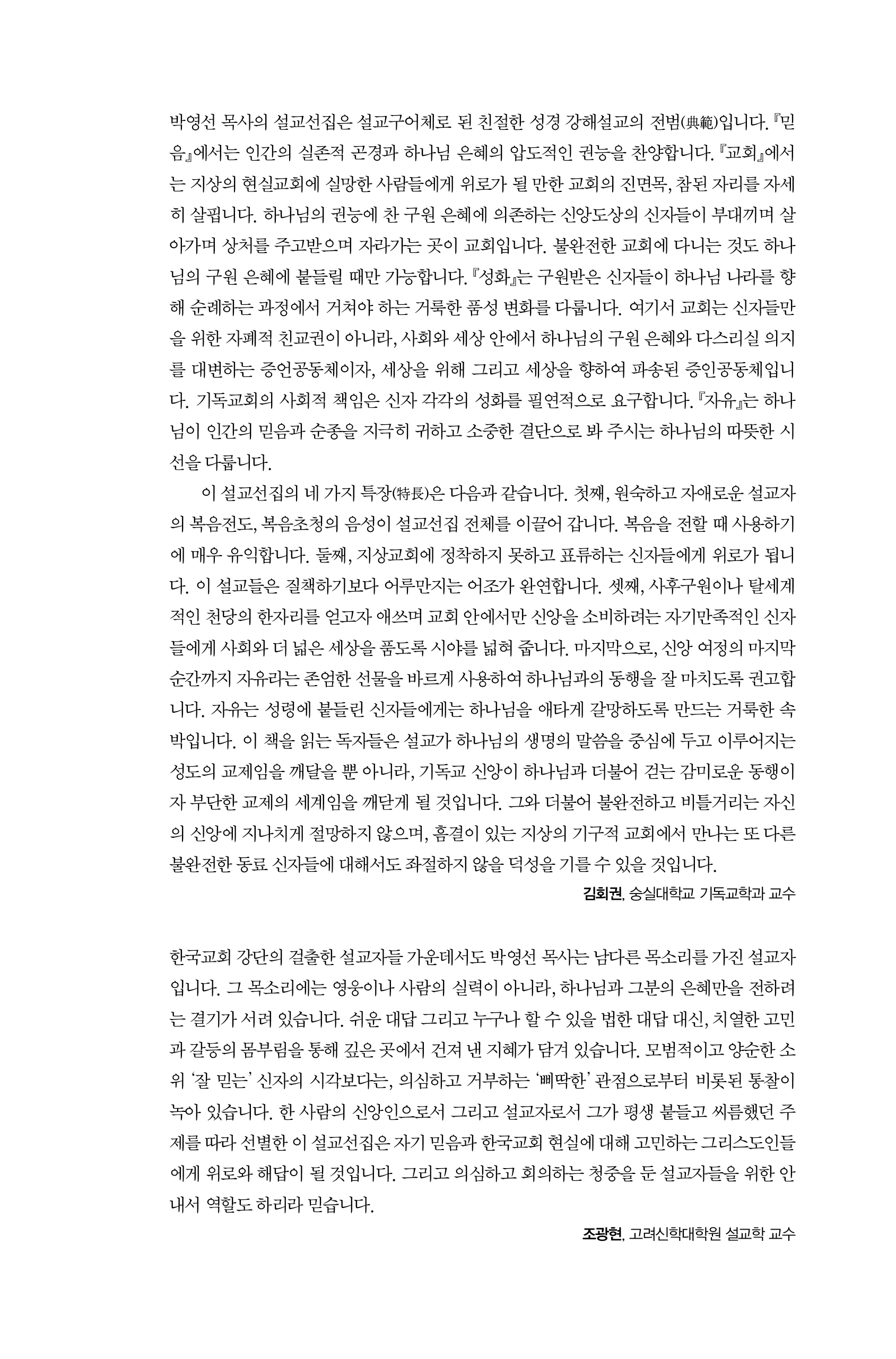 이 설교선집의 네 가지 특장(特長)은 다음과 같습니다. 첫째, 원숙하고 자애로운 설교자의 복음전도, 복음초청의 음성이 설교선집 전체를 이끌어 갑니다. 복음을 전할 때 사용하기에 매우 유익합니다. 둘째, 지상교회에 정착하지 못하고 표류하는 신자들에게 위로가 됩니다. 이 설교들은 질책하기보다 어루만지는 어조가 완연합니다. 셋째, 사후구원이나 탈세계적인 천당의 한자리를 얻고자 애쓰며 교회 안에서만 신앙을 소비하려는 자기만족적인 신자들에게 사회와 더 넓은 세상을 품도록 시야를 넓혀 줍니다. 마지막으로, 신앙 여정의 마지막 순간까지 자유라는 존엄한 선물을 바르게 사용하여 하나님과의 동행을 잘 마치도록 권고합니다. 자유는 성령에 붙들린 신자들에게는 하나님을 애타게 갈망하도록 만드는 거룩한 속박입니다. 이 책을 읽는 독자들은 설교가 하나님의 생명의 말씀을 중심에 두고 이루어지는 성도의 교제임을 깨달을 뿐 아니라, 기독교 신앙이 하나님과 더불어 걷는 감미로운 동행이자 부단한 교제의 세계임을 깨닫게 될 것입니다. 그와 더불어 불완전하고 비틀거리는 자신의 신앙에 지나치게 절망하지 않으며, 흠결이 있는 지상의 기구적 교회에서 만나는 또 다른 불완전한 동료 신자들에 대해서도 좌절하지 않을 덕성을 기를 수 있을 것입니다.