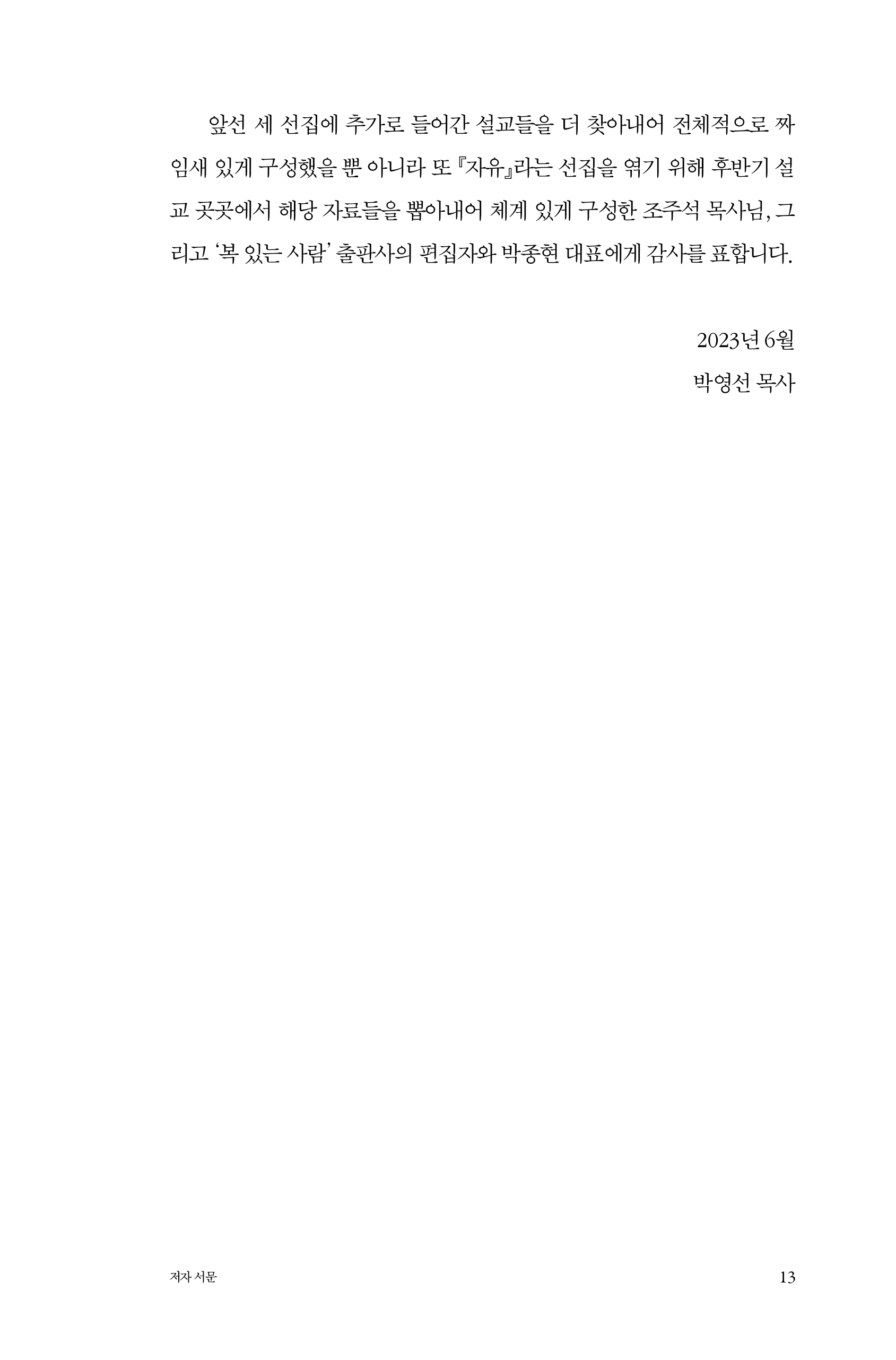 - 지금까지 출간된 설교집 가운데서 ‘자유’에 관한 설교를 선별하여 주제의 논리성을 살려 배열했다.
